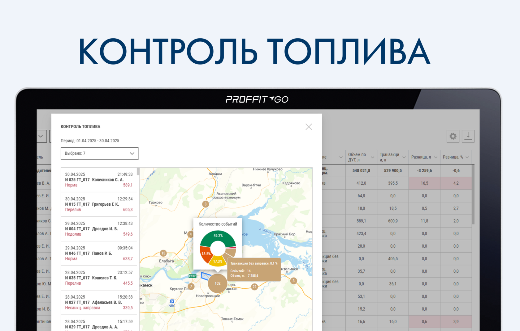 Контроль топлива — ваш помощник в минимизации затрат на топливо за счёт автоматической сверки платёжных транзакций с реальными заправками (по данным ДУТ). Результат сверки - сводный отчёт о расхождениях в объёмах оплаченного и фактически заправленного топлива с детальной информацией по каждому случаю.